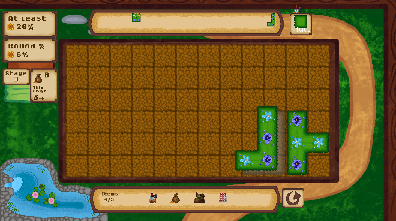 A gardening, puzzler, rogue-like, where you place different tiles to fill up a grid to an increasingly high percentage. Buy Modifiers and Power-Ups to get as high a score as you can! (Modifiers and Power-Ups are unfortunately broken, and as such did not make the cut for the final build. Along with this progression is sadly broken, so the first stage is the only Accesible stage.)(We also start you at stage 3 for this because otherwise it would just be super boring :/ )